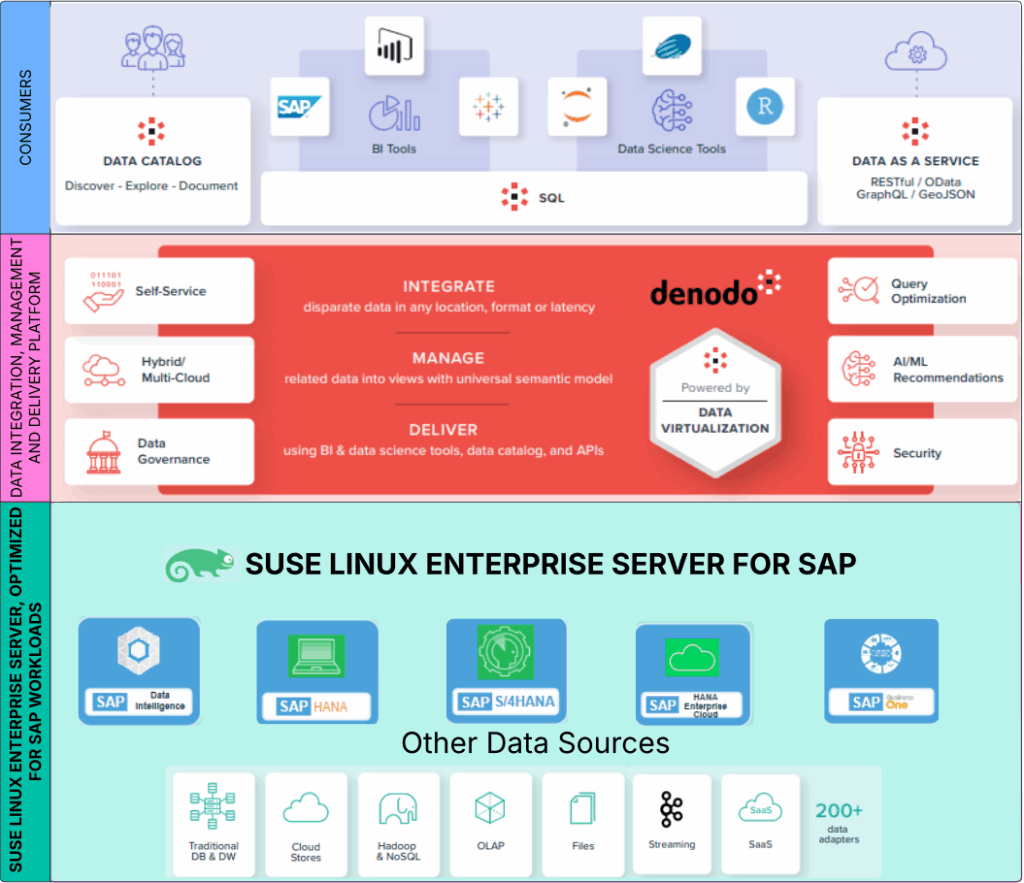 The two main components are SUSE Linux Enterprise Server for SAP Applications, which provides high availability and optimized system performance, and the Denodo Platform, which delivers real-time data access across SAP and non-SAP systems, without requiring traditional data replication such as extract, transform, and load (ETL) processes (see the diagram below).